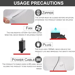 1. Don't cover any pieced off stuffs on the inflator fan when used.